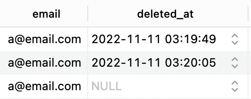 常見的問題會發生在刪除用戶資料,假設我們有一張表 users.email 為 unique 的